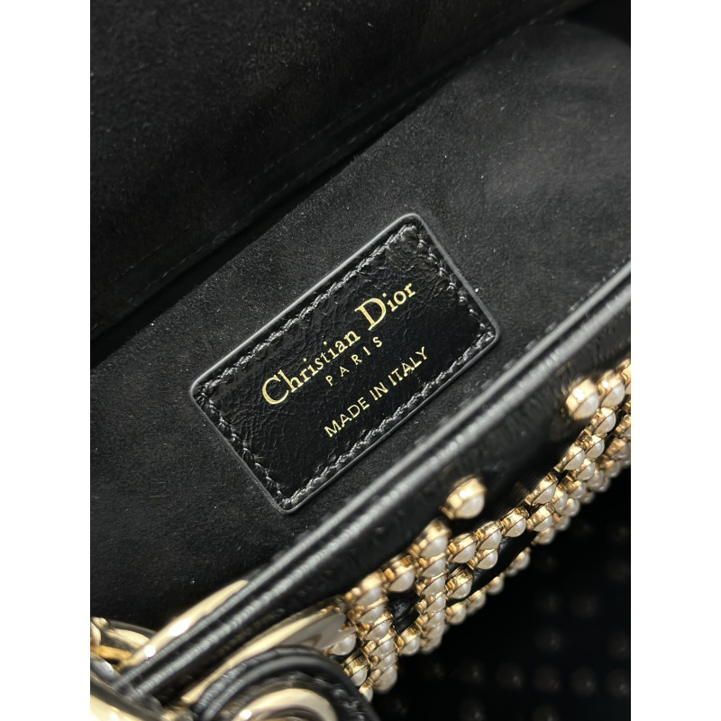 DetailFeaturing tonal mini beadwork in lattice patterns, showcasing Dior's exquisite craftsmanship. Accented with light gold-tone metal D.I.O.R. charms for an elegant silhouette. This compact design includes a detachable chain shoulder strap and adjustable leather strap, ideal for everyday versatility.