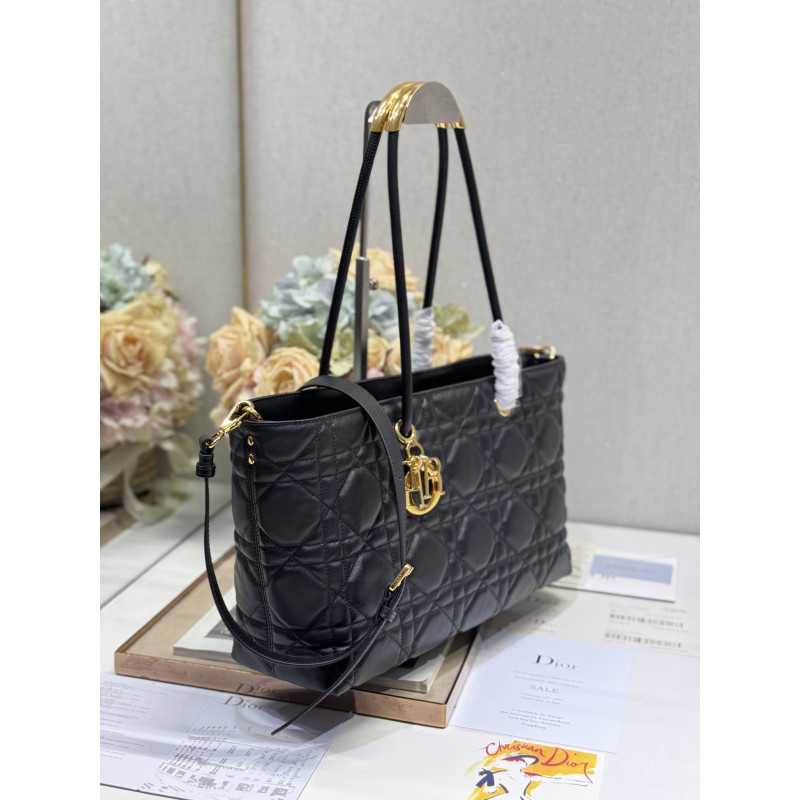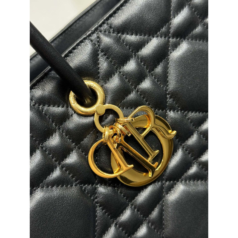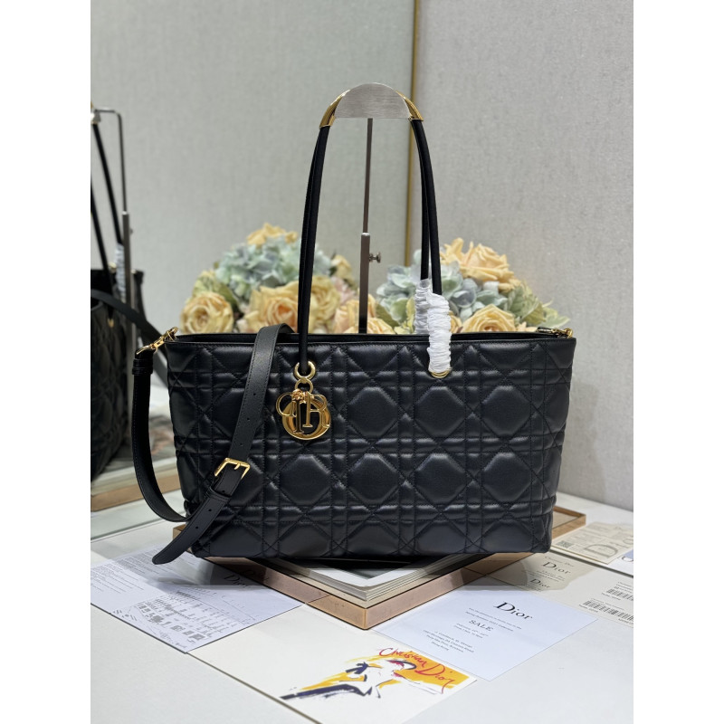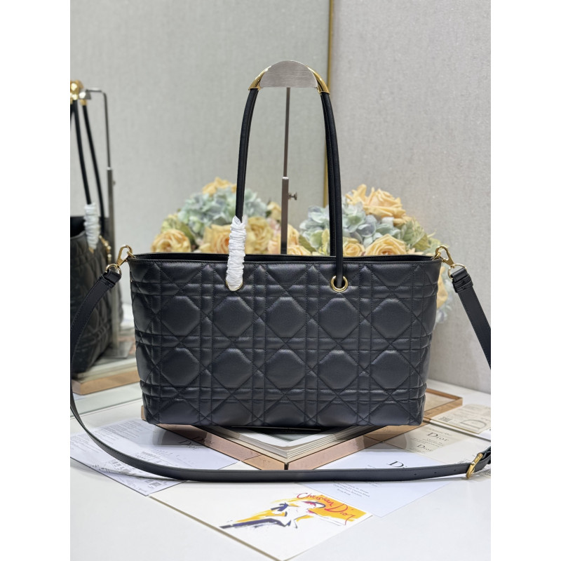 This Dior Toujours handbag is meticulously crafted from black calfskin, featuring oversized Cannage topstitching. Its spacious interior compartment allows for neat storage of daily essentials. The structured top handles, adorned with vintage-finish metal accents, offer effortless hand-carry options, while the adjustable leather shoulder strap provides versatile styling.