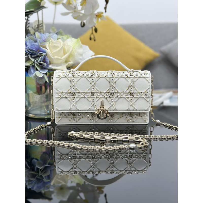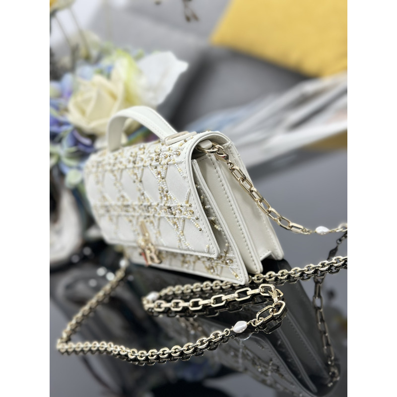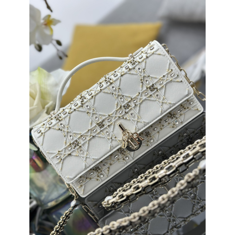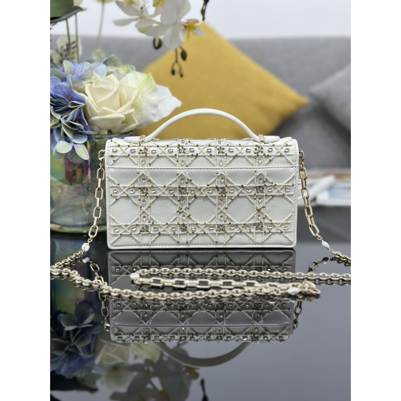 DetailEmbellished with embroidered gold beads, this piece strikes the perfect balance between elegance and practicality. Expertly crafted from leather with cane-pattern topstitching, it features a flap accented with a D.I.O.R. charm. Two compartments and a zip pouch provide ample space for daily essentials, making it a versatile choice for both everyday and evening ensembles.