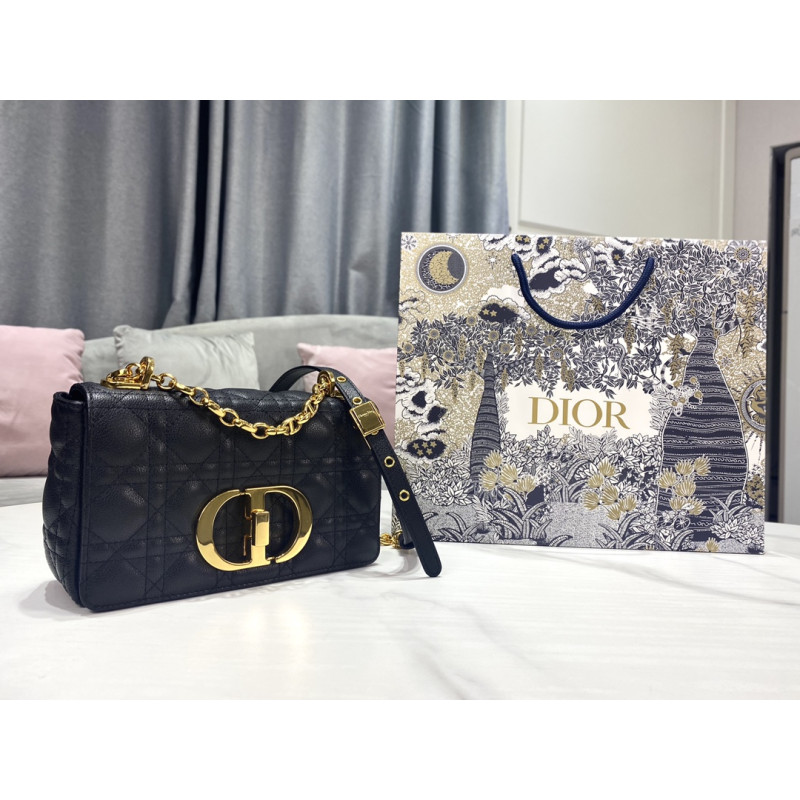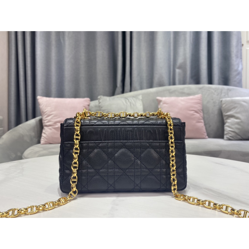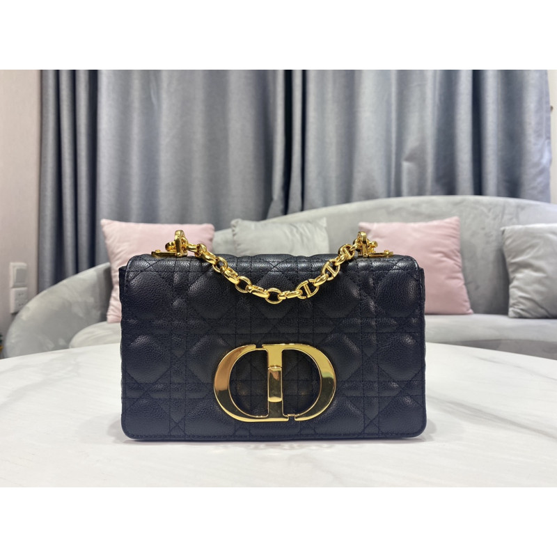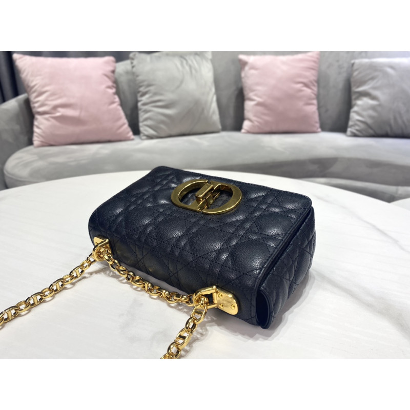 Crafted from calfskin with Cannage stitching. Antique gold-plated metal 'CD' button on the flap, adjustable and detachable chain shoulder strap with 'CD' logo links, can be carried by hand, shoulder or crossbody, and can be matched with different embroidered shoulder straps.
