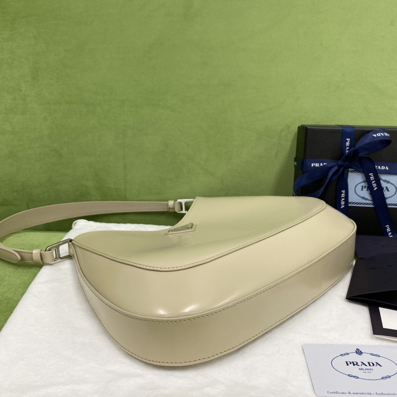 DetailThe special beveled structure of the bottom and sides of this flap bag emphasizes the smooth curved lines and gives it a sophisticated appeal, while the extended handles make it even more functional, allowing it to be worn as a shoulder bag or a tote. Brushed leather, unique to the Prada collection, is a modern, color-changing material perfect for new combinations and contrasts. A triangular enameled logo completes the silhouette.