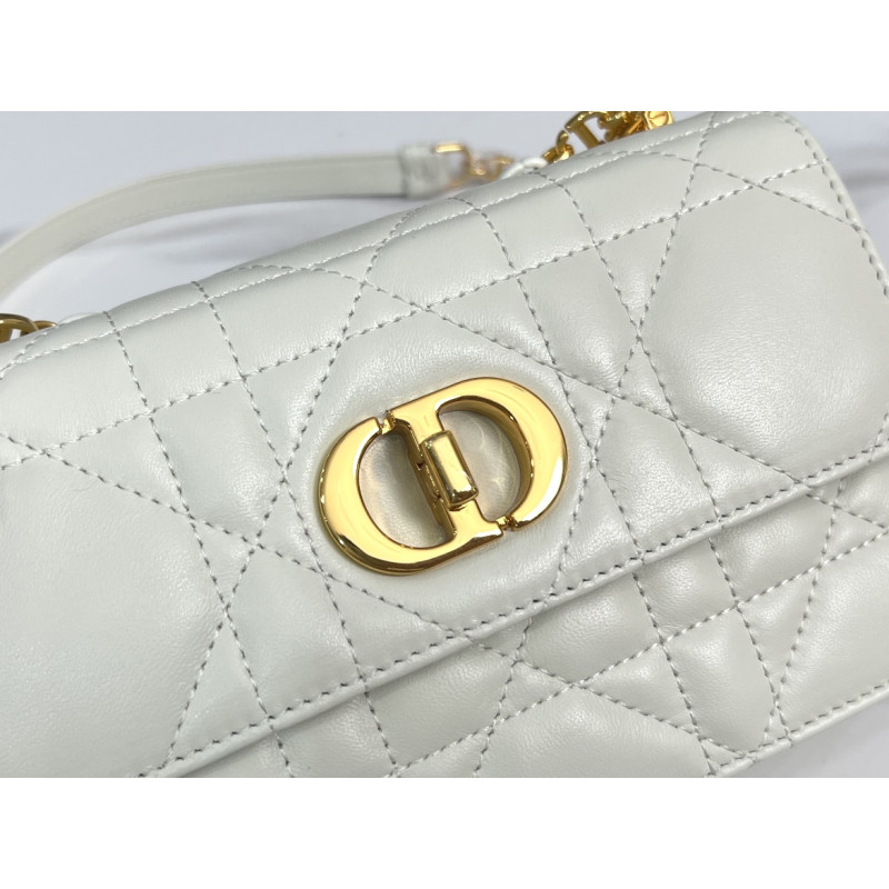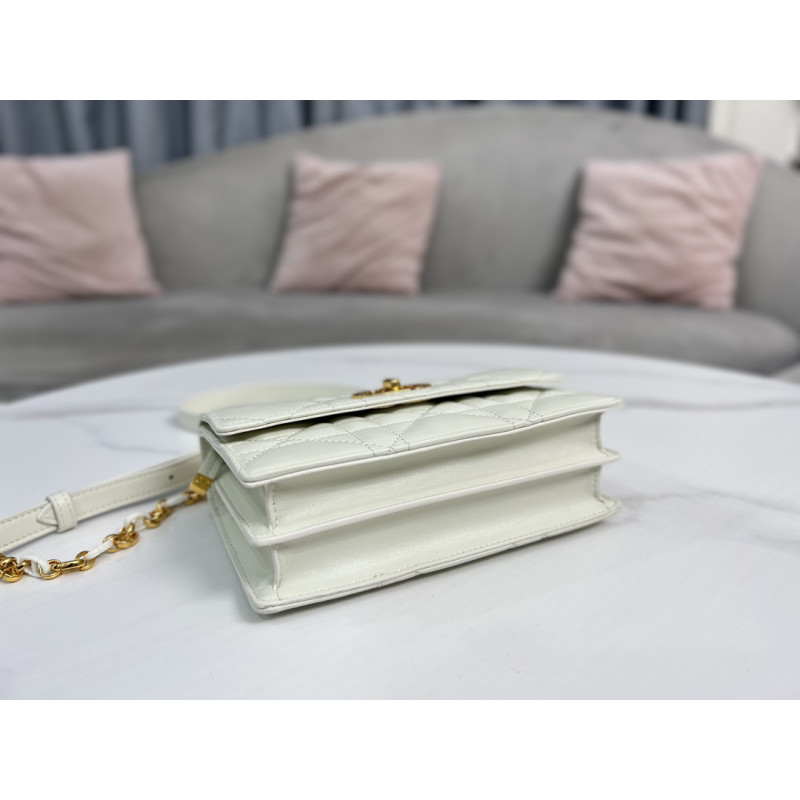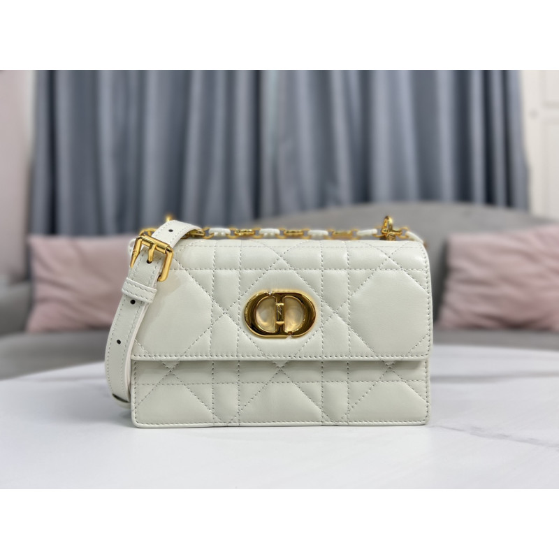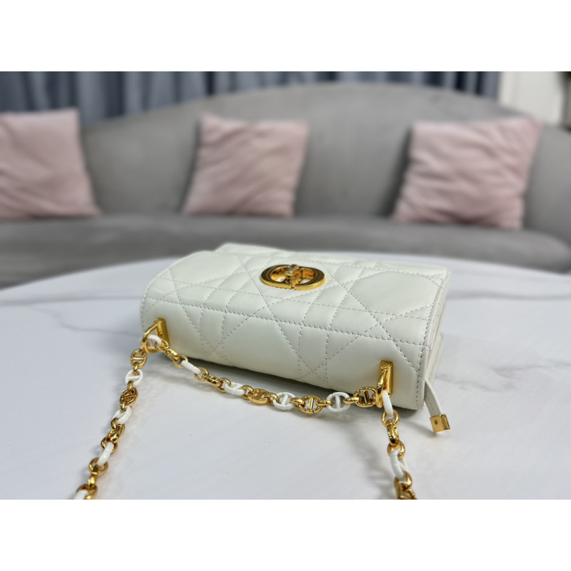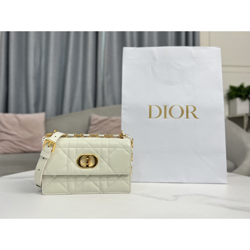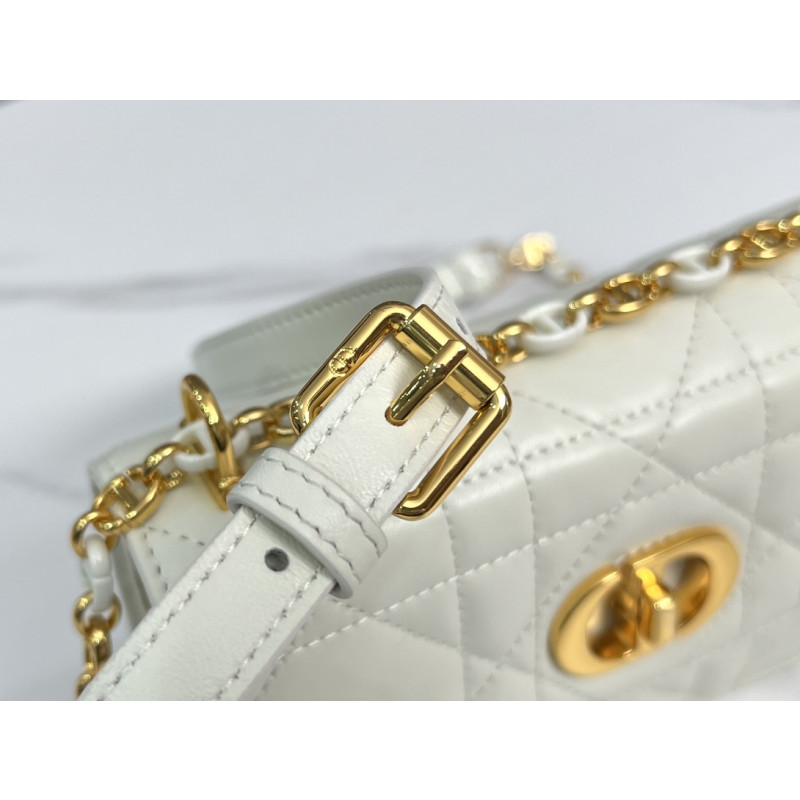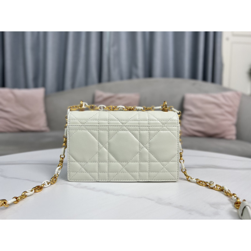 Made of lambskin with unique quilted Macrocannage effect, gold-finish metal CD button closure on flap, adjustable chain shoulder strap between gold-finish metal links and tonal enamel links to match the leather alternates with leather inserts for added comfort when carried by hand or cross-body.