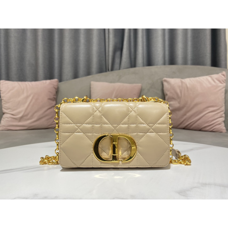 Crafted from calfskin with Cannage stitching. Antique gold-plated metal 'CD' button on the flap, adjustable and detachable chain shoulder strap with 'CD' logo links, can be carried by hand, shoulder or crossbody, and can be matched with different embroidered shoulder straps.