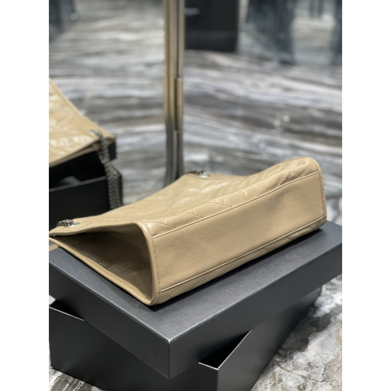 Magnetic snap closure with leather-covered YSL initials and quilted stitching, and leather-reinforced chain handle. There is 1 inner zipper pocket, 1 open pocket, light weight, large capacity, strong practicability.